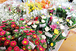 旬の野菜や果物の他に、色とりどりの切り花などが並びます。