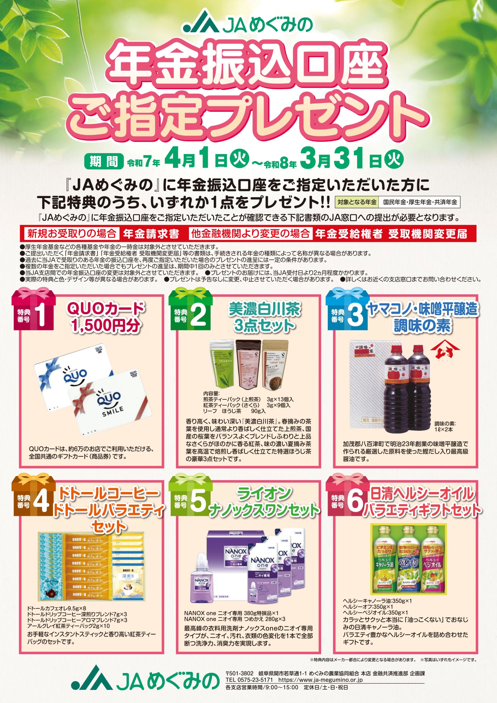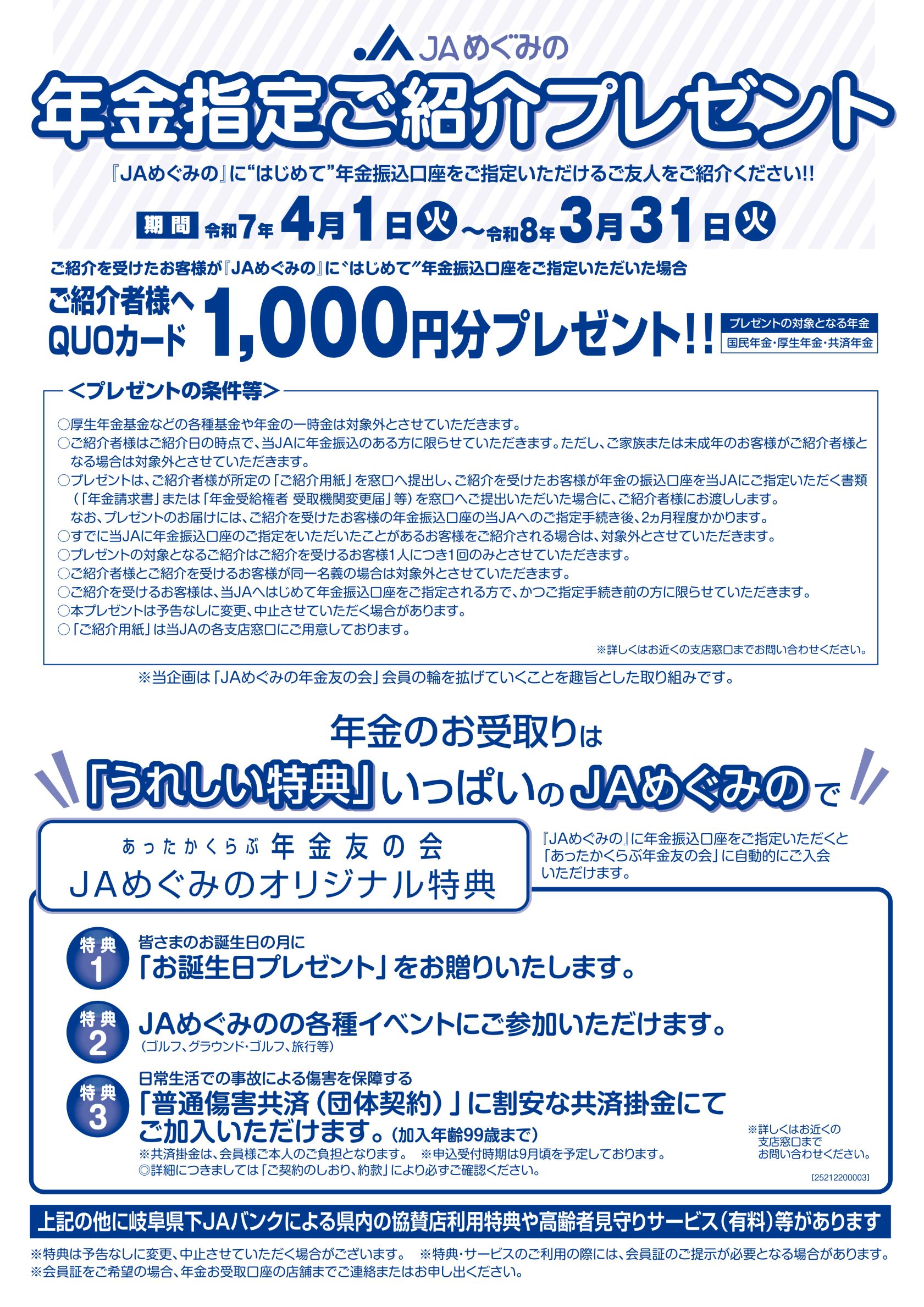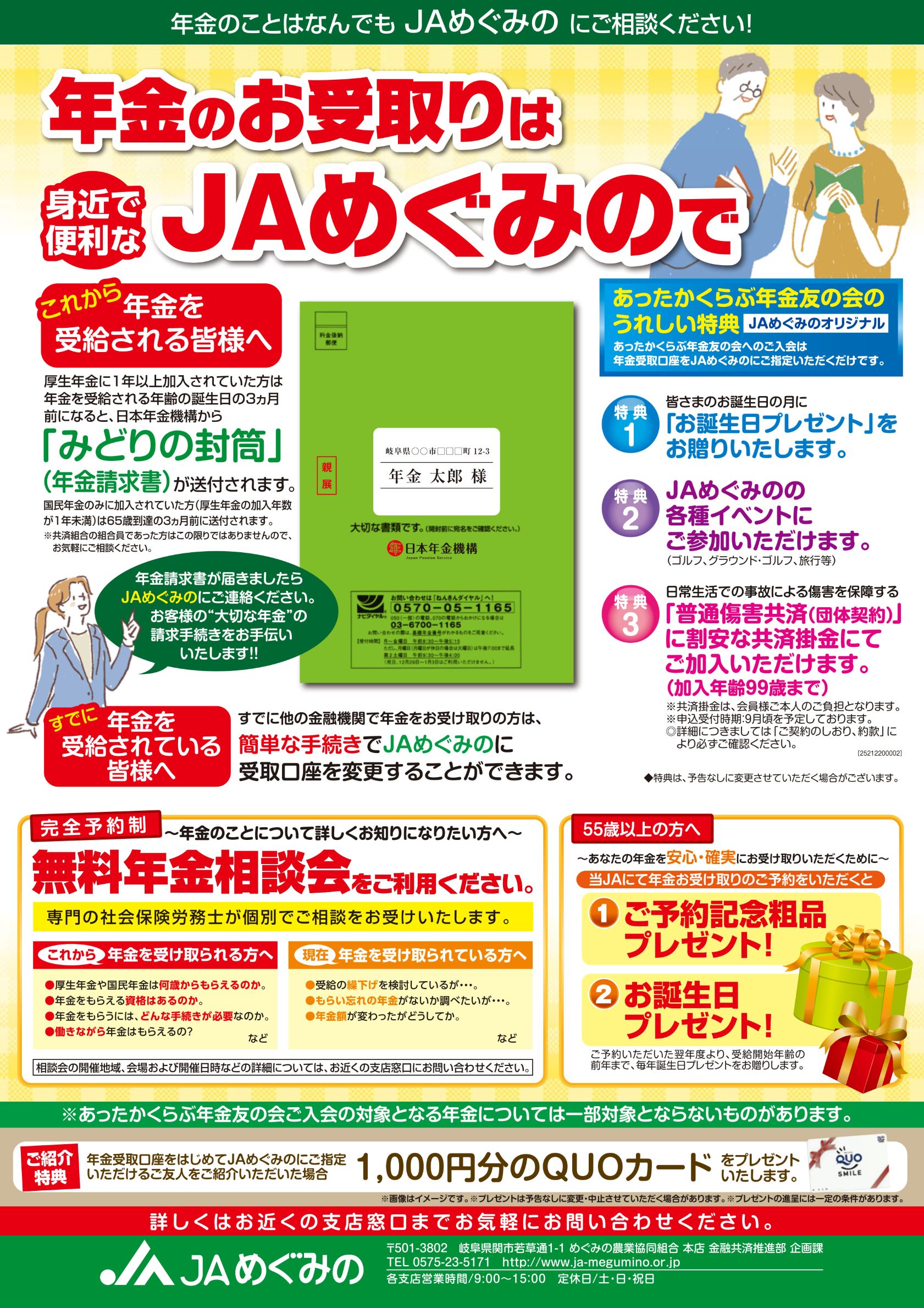 JAめぐみので公的年金のお受取りをご指定いただいた方にはご成約プレゼントをお届けします。