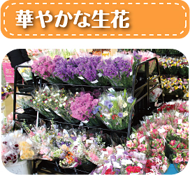 ![]() 年間を通じ、四季折々の切花、鉢花が並びます。春夏には鉢花が、お彼岸にはお供え用の切花、組花が充実。安らぎと華やかさのある暮らしをおススメします。 |