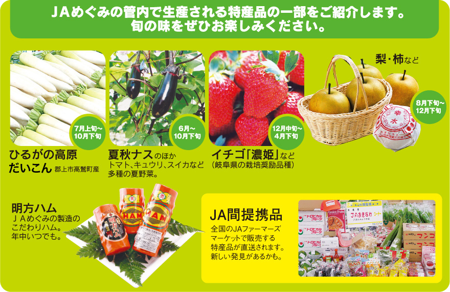 ![]() 中濃・郡上・みのかも・可児地域から季節の農畜産物が大集合。安全だから安心して食べられ、その日に収穫されたものや各産地から直送されたものが毎日並ぶため、新鮮です。また地元産中心に良質なお米を販売。玄米をその場で精米するから、いつでもおいしく食べられます。 |