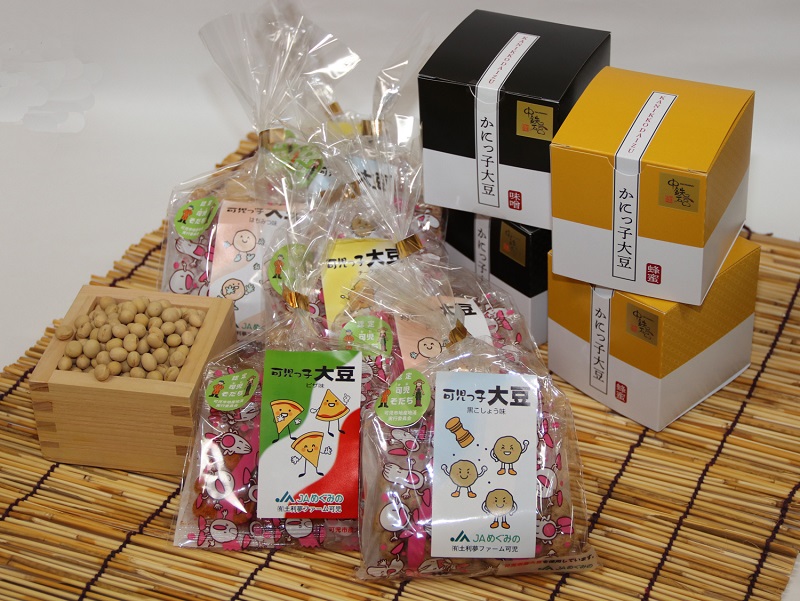 可児っ子大豆カリッコは、岐阜県可児市の農業生産法人と大豆卸業者、製造業者との共同開発により、「大豆をたくさんの人に食べてもらいたい…」そんな気持ちから誕生した、可児の大豆がまるごとスナックになったお菓子です。JA出資農業生産法人(有)土利夢(ドリーム)ファーム可児が生産した可児市産の大豆を、(株)出由本店独自の製法で歯ざわりの良い個性のある味付けにしています。